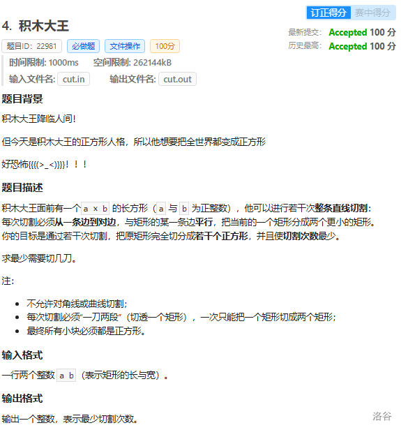 又花了差不多半个小时(?),条了代码里的小错误。这题,因为一开始没完全理解就开始写代码,导致到了后面我开始搞不清 n 和 m 分别是什么东西。因此,后面 n 和 m 写错了好几次。但是,到了最后面,居然还是把样例调出来了,甚至自己编的一组样例也过了。然后就交了。